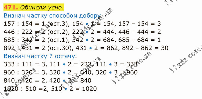 Обчисли усно. Визнач частку способом добору. 157 : 154 = 1 (ост.3), 154 • 1 = 154, 157 – 154 = 3 446 : 222 = 2 (ост.2), 222 • 2 = 444, 446 – 444 = 2 685 : 342 = 2 (ост.1), 342 • 2 = 684, 685 – 684 = 1 892 : 431 = 2 (ост.30), 431 • 2 = 862, 892 – 862 = 30 Визнач частку й остачу. 333 : 111 = 3, 111 • 2 = 222, 111 • 3 = 333 960 : 320 = 3, 320 • 2 = 640, 320 • 3 = 960 840 : 420 = 2, 420 • 2 = 840 1020 : 510 =2, 510 • 2 = 1020