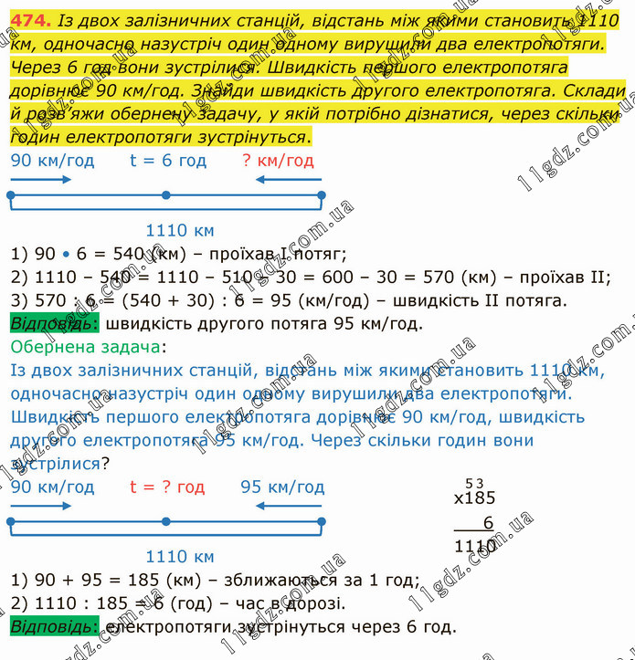 Із двох залізничних станцій, відстань між якими становить 1110 км, одночасно назустріч один одному вирушили два електропотяги. Через 6 год вони зустрілися. Швидкість першого електропотяга дорівнює 90 км/год. Знайди швидкість другого електропотяга. Склади й розв’яжи обернену задачу, у якій потрібно дізнатися, через скільки годин електропотяги зустрінуться. 90 км/год t = 6 год ? км/год 1110 км 1) 90 • 6 = 540 (км) – проїхав І потяг; 2) 1110 – 540 = 1110 – 510 – 30 = 600 – 30 = 570 (км) – проїхав ІІ; 3) 570 : 6 = (540 + 30) : 6 = 95 (км/год) – швидкість ІІ потяга. Відповідь: швидкість другого потяга 95 км/год. Обернена задача: Із двох залізничних станцій, відстань між якими становить 1110 км, одночасно назустріч один одному вирушили два електропотяги. Швидкість першого електропотяга дорівнює 90 км/год, швидкість другого електропотяга 95 км/год. Через скільки годин вони зустрілися? 90 км/год t = ? год 95 км/год 1110 км х1(5)8(3)5 6 1110 1) 90 + 95 = 185 (км) – зближаються за 1 год; 2) 1110 : 185 = 6 (год) – час в дорозі. Відповідь: електропотяги зустрінуться через 6 год.