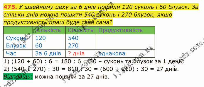 У швейному цеху за 6 днів пошили 120 суконь і 60 блузок. За скільки днів можна пошити 540 суконь і 270 блузок, якщо продуктивність праці буде така сама? Кількість Кількість Продуктивність Суконь Блузок 120 60 540 270 Час За 6 днів ? днів однакова 1) (120 + 60) : 6 = 180 : 6 = 30 – суконь та блузок за 1 день; 2) (540 + 270) : 30 = 810 : 30 = (600 + 210) : 30 = 27 днів. Відповідь: можна пошити за 27 днів.