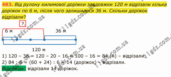 Від рулону килимової доріжки завдовжки 120 м відрізали кілька доріжок по 6 м, після чого залишилося 36 м. Скільки доріжок відрізали? ?. 6 м 36 м 120 м 1) 120 – 36 = 120 – 20 – 16 = 100 – 16 = 84 (м) – відрізали; 2) 84 : 6 = (60 + 24) : 6 = 14 (доріжок) – відрізали. Відповідь: відрізали 14 доріжок.