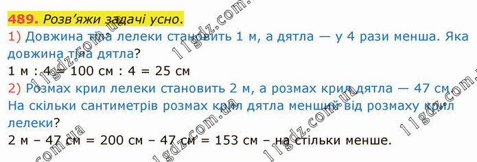 Розв’яжи задачі усно. 1) Довжина тіла лелеки становить 1 м, а дятла — у 4 рази менша. Яка довжина тіла дятла? 1 м : 4 = 100 см : 4 = 25 см 2) Розмах крил лелеки становить 2 м, а розмах крил дятла — 47 см. На скільки сантиметрів розмах крил дятла менший від розмаху крил лелеки? 2 м – 47 см = 200 см – 47 см = 153 см – на стільки менше.
