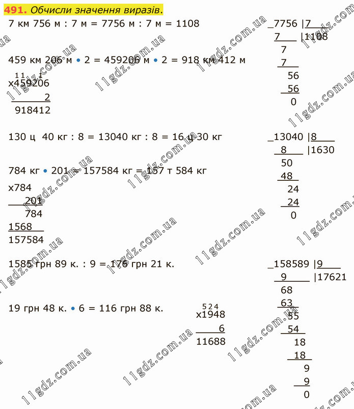 7 км 756 м : 7 м = 7756 м : 7 м = 1108 130 ц 40 кг : 8 = 13040 кг : 8 = 16 ц 30 кг 784 кг • 201 = 157584 кг = 157 т 584 кг