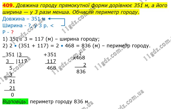 Довжина городу прямокутної форми дорівнює 351 м, а його ширина — у 3 рази менша. Обчисли периметр городу. Довжина – 351 м Ширина - ?, у 3 р. < Р - ? 1) 351 : 3 = 117 (м) – ширина городу; 2) 2 • (351 + 117) = 2 • 468 = 836 (м) – периметр городу. Відповідь: периметр городу 836 м.