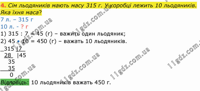 Сім льодяників мають масу 315 г. У коробці лежить 10 льодяників. Яка їхня маса? 7 л. – 315 г 10 л. - ? г 1) 315 : 7 = 45 (г) – важить один льодяник; 2) 45 • 10 = 450 (г) – важать 10 льодяників.