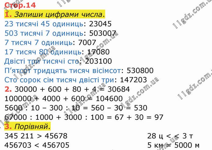 Запиши цифрами числа. 23 тисячі 45 одиниць: 23045 503 тисячі 7 одиниць: 503007 7 тисяч 7 одиниць: 7007 17 тисяч 80 одиниць: 17080 Двісті три тисячі сто: 203100 П’ятсот тридцять тисяч вісімсот: 530800 Сто сорок сім тисяч двісті три: 147203 2. 30000 + 600 + 80 + 4 = 30684 100000 + 4000 + 600 = 104600 5600 : 10 – 300 : 10 = 560 – 30 = 530 67000 : 1000 + 3000 : 100 = 67 + 30 = 97 3. Порівняй. 345 211 > 45678 456703 < 456705 28 ц < < 3 т 5 км = 5000 м