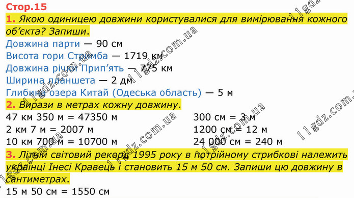 Якою одиницею довжини користувалися для вимірювання кожного об’єкта? Запиши. Довжина парти — 90 см Висота гори Стримба — 1719 км Довжина річки Прип’ять — 775 км Ширина планшета — 2 дм Глибина озера Китай (Одеська область) — 5 м 2. Вирази в метрах кожну довжину. 47 км 350 м = 47350 м 2 км 7 м = 2007 м 10 км 700 м = 10700 м 300 см = 3 м 1200 см = 12 м 24 000 см = 240 м 3. Літній світовий рекорд 1995 року в потрійному стрибкові належить українці Інесі Кравець і становить 15 м 50 см. Запиши цю довжину в сантиметрах. 15 м 50 см = 1550 см