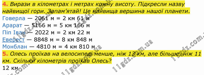 Вирази в кілометрах і метрах кожну висоту. Підкресли назву найвищої гори. Запам’ятай! Це найвища вершина нашої планети. Говерла — 2061 м = 2 км 61 м Арарат — 5166 м = 5 км 166 м Піп Іван — 2022 м = 2 км 22 м Еверест — 8848 м = 8 км 848 м Монблан — 4810 м = 4 км 810 м 5. Олесь проїхав на велосипеді менше, ніж 13 км, але більше, ніж 11 км. Скільки кілометрів проїхав Олесь? 12 км