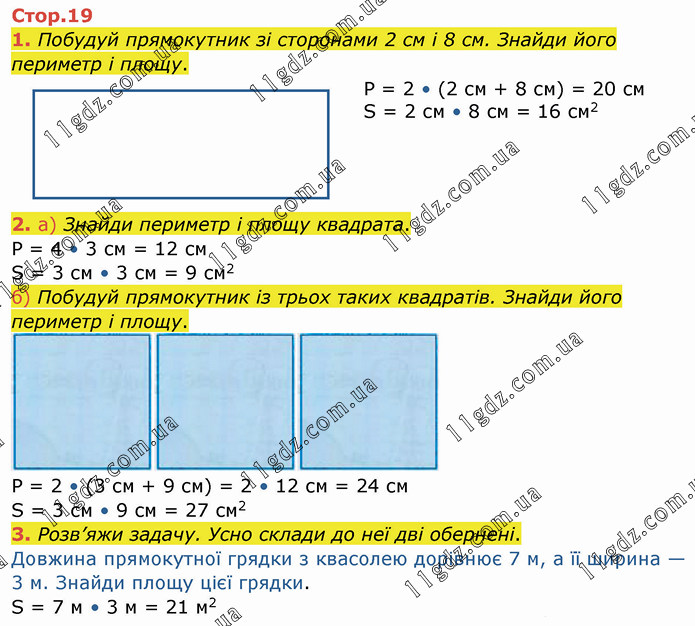 Побудуй прямокутник зі сторонами 2 см і 8 см. Знайди його периметр і площу. Р = 2 • (2 см + 8 см) = 20 см S = 2 см • 8 см = 16 см2 2. а) Знайди периметр і площу квадрата. Р = 4 • 3 см = 12 см S = 3 см • 3 см = 9 см2 б) Побудуй прямокутник із трьох таких квадратів. Знайди його периметр і площу. Р = 2 • (3 см + 9 см) = 2 • 12 см = 24 см S = 3 см • 9 см = 27 см2 3. Розв’яжи задачу. Усно склади до неї дві обернені. Довжина прямокутної грядки з квасолею дорівнює 7 м, а її ширина — 3 м. Знайди площу цієї грядки. S = 7 см • 3 см = 21 см2