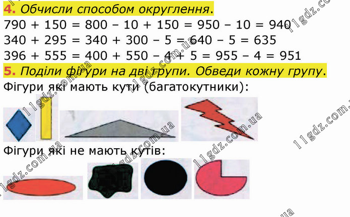 Обчисли способом округлення. 790 + 150 = 800 – 10 + 150 = 950 – 10 = 940 340 + 295 = 340 + 300 – 5 = 640 – 5 = 635 396 + 555 = 400 + 550 – 4 + 5 = 955 – 4 = 951 5. Поділи фігури на дві групи. Обведи кожну групу. Фігури які мають кути (багатокутники): Фігури які не мають кутів: