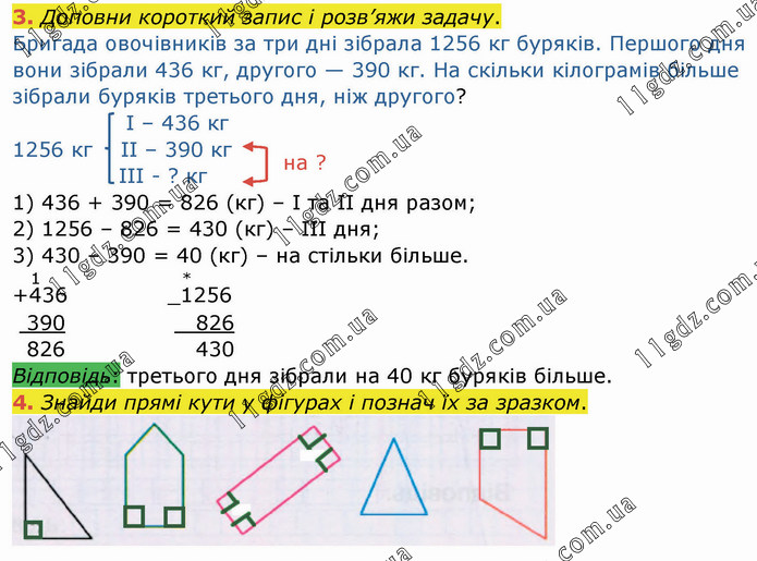 Доповни короткий запис і розв’яжи задачу. Бригада овочівників за три дні зібрала 1256 кг буряків. Першого дня вони зібрали 436 кг, другого — 390 кг. На скільки кілограмів більше зібрали буряків третього дня, ніж другого? І – 436 кг 1256 кг ІІ – 390 кг ІІІ - ? кг 1) 436 + 390 = 826 (кг) – І та ІІ дня разом; 2) 1256 – 826 = 430 (кг) – ІІІ дня; 3) 430 – 390 = 40 (кг) – на стільки більше. Відповідь: третього дня зібрали на 40 кг буряків більше. 4. Знайди прямі кути у фігурах і познач їх за зразком.