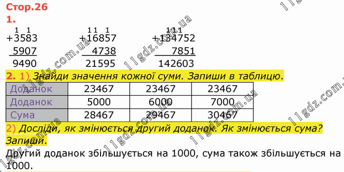 1) Знайди значення кожної суми. Запиши в таблицю. Доданок 23467 23467 23467 Доданок 5000 6000 7000 Сума 28467 29467 30467 2) Досліди, як змінюється другий доданок. Як змінюється сума? Запиши. Другий доданок збільшується на 1000, сума також збільшується на 1000.
