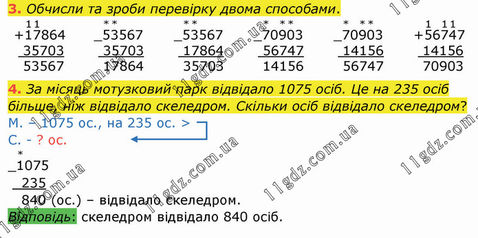 За місяць мотузковий парк відвідало 1075 осіб. Це на 235 осіб більше, ніж відвідало скеледром. Скільки осіб відвідало скеледром? М. – 1075 ос., на 235 ос. > С. - ? ос. _1075 235 840 (ос.) – відвідало скеледром. Відповідь: скеледром відвідало 840 осіб.