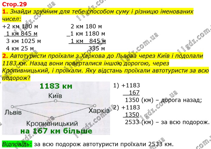 Знайди зручним для тебе способом суму і різницю іменованих чисел: 2. Автотуристи проїхали з Харкова до Львова через Київ і подолали 1183 км. Назад вони поверталися іншою дорогою, через Кропивницький, і проїхали. Яку відстань проїхали автотуристи за всю подорож? Відповідь: за всю подорож автотуристи проїхали 2533 км.