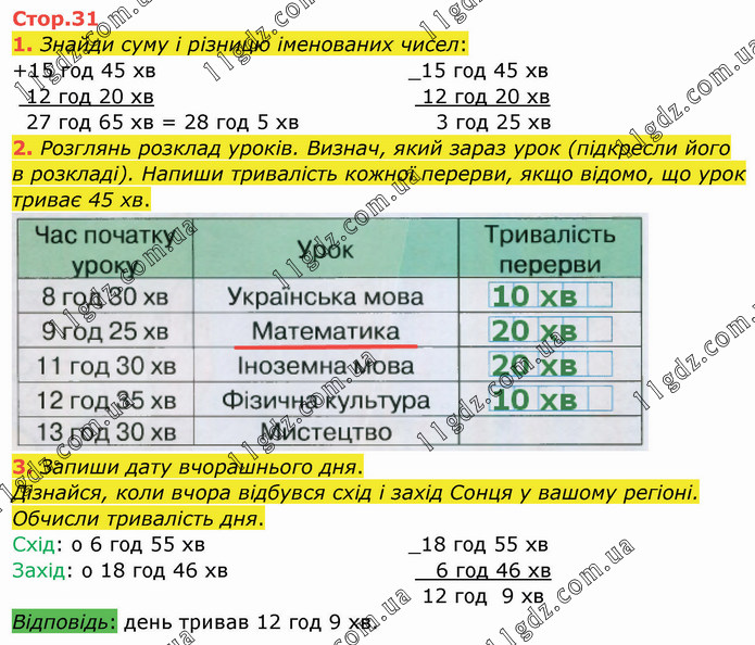 Розглянь розклад уроків. Визнач, який зараз урок (підкресли його в розкладі). Напиши тривалість кожної перерви, якщо відомо, що урок триває 45 хв. Запиши дату вчорашнього дня. Дізнайся, коли вчора відбувся схід і захід Сонця у вашому регіоні. Обчисли тривалість дня. Схід: о 6 год 55 хв Захід: о 18 год 46 хв