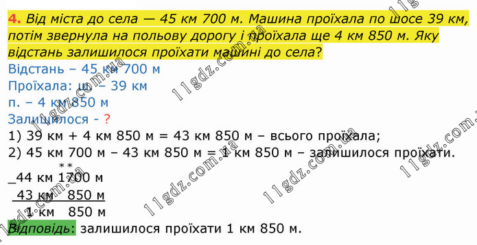 Від міста до села — 45 км 700 м. Машина проїхала по шосе 39 км, потім звернула на польову дорогу і проїхала ще 4 км 850 м. Яку відстань залишилося проїхати машині до села? Відстань – 45 км 700 м Проїхала: ш. – 39 км п. – 4 км 850 м Залишилося - ? 1) 39 км + 4 км 850 м = 43 км 850 м – всього проїхала; 2) 45 км 700 м – 43 км 850 м = 1 км 850 м – залишилося проїхати.
