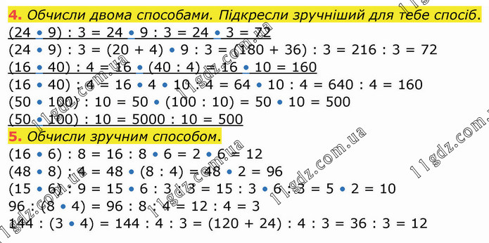 Обчисли двома способами. Підкресли зручніший для тебе спосіб. (24 • 9) : 3 = 24 • 9 : 3 = 24 • 3 = 72 (24 • 9) : 3 = (20 + 4) • 9 : 3 = (180 + 36) : 3 = 216 : 3 = 72 (16 • 40) : 4 = 16 • (40 : 4) = 16 • 10 = 160 (16 • 40) : 4 = 16 • 4 • 10 : 4 = 64 • 10 : 4 = 640 : 4 = 160 (50 • 100) : 10 = 50 • (100 : 10) = 50 • 10 = 500 (50 • 100) : 10 = 5000 : 10 = 500 5. Обчисли зручним способом. (16 • 6) : 8 = 16 : 8 • 6 = 2 • 6 = 12 (48 • 8) : 4 = 48 • (8 : 4) = 48 • 2 = 96 (15 • 6) : 9 = 15 • 6 : 3 : 3 = 15 : 3 • 6 : 3 = 5 • 2 = 10 96 : (8 • 4) = 96 : 8 : 4 = 12 : 4 = 3 144 : (3 • 4) = 144 : 4 : 3 = (120 + 24) : 4 : 3 = 36 : 3 = 12