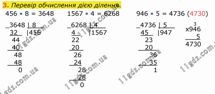 Перевір обчислення дією ділення. 456 • 8 = 3648 1567 • 4 = 6268 946 • 5 = 4736 (4730)