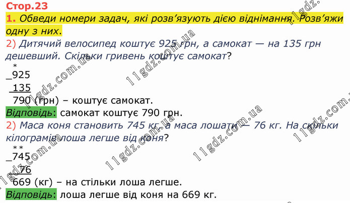 Обведи номери задач, які розв’язують дією віднімання. Розв’яжи одну з них. 2) Дитячий велосипед коштує 925 грн, а самокат — на 135 грн дешевший. Скільки гривень коштує самокат? _925 135 790 (грн) – коштує самокат. Відповідь: самокат коштує 790 грн. 2) Маса коня становить 745 кг, а маса лошати — 76 кг. На скільки кілограмів лоша легше від коня? _7(*)4(*)5 76 669 (кг) – на стільки лоша легше. Відповідь: лоша легше від коня на 669 кг.