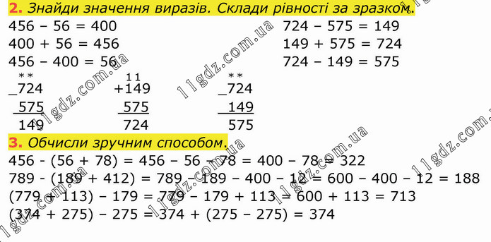 Знайди значення виразів. Склади рівності за зразком. 456 – 56 = 400 400 + 56 = 456 456 – 400 = 56 724 – 575 = 149 149 + 575 = 724 724 – 149 = 575 Обчисли зручним способом. 456 - (56 + 78) = 456 – 56 – 78 = 400 – 78 = 322 789 - (189 + 412) = 789 – 189 – 400 – 12 = 600 – 400 – 12 = 188 (779 + 113) – 179 = 779 – 179 + 113 = 600 + 113 = 713 (374 + 275) – 275 = 374 + (275 – 275) = 374