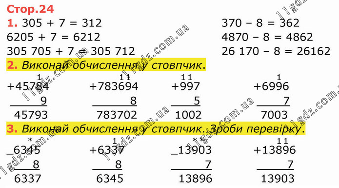 305 + 7 = 312 6205 + 7 = 6212 305 705 + 7 = 305 712 370 – 8 = 362 4870 – 8 = 4862 26 170 – 8 = 26162