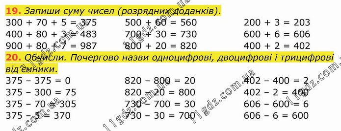 Запиши суму чисел (розрядних доданків). 300 + 70 + 5 = 375 400 + 80 + 3 = 483 900 + 80 + 7 = 987 500 + 60 = 560 700 + 30 = 730 800 + 20 = 820 200 + 3 = 203 600 + 6 = 606 400 + 2 = 402 20. Обчисли. Почергово назви одноцифрові, двоцифрові і трицифрові від’ємники. 375 – 375 = 0 375 – 300 = 75 375 – 70 = 305 375 – 5 = 370 820 – 800 = 20 820 – 20 = 800 730 – 700 = 30 730 – 30 = 700 402 – 400 = 2 402 – 2 = 400 606 – 600 = 6 606 – 6 = 600