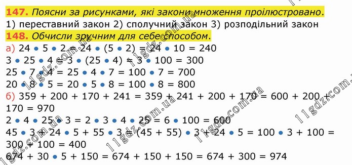 Поясни за рисунками, які закони множення проілюстровано. 1) переставний закон 2) сполучний закон 3) розподільний закон 148. Обчисли зручним для себе способом. а) 24 ● 5 ● 2 = 24 ● (5 ● 2) = 24 ● 10 = 240 3 ● 25 ● 4 = 3 ● (25 ● 4) = 3 ● 100 = 300 25 ● 7 ● 4 = 25 ● 4 ● 7 = 100 ● 7 = 700 20 ● 8 ● 5 = 20 ● 5 ● 8 = 100 ● 8 = 800 б) 359 + 200 + 170 + 241 = 359 + 241 + 200 + 170 = 600 + 200 + 170 = 970 2 ● 4 ● 25 ● 3 = 2 ● 3 ● 4 ● 25 = 6 ● 100 = 600 45 ● 3 + 24 ● 5 + 55 ● 3 = (45 + 55) ● 3 + 24 ● 5 = 100 ● 3 + 100 = 300 + 100 = 400 674 + 30 ● 5 + 150 = 674 + 150 + 150 = 674 + 300 = 974