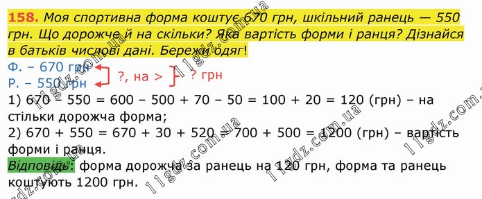 Моя спортивна форма коштує 670 грн, шкільний ранець — 550 грн. Що дорожче й на скільки? Яка вартість форми і ранця? Дізнайся в батьків числові дані. Бережи одяг! Ф. – 670 грн Р. – 550 грн 1) 670 – 550 = 600 – 500 + 70 – 50 = 100 + 20 = 120 (грн) – на стільки дорожча форма; 2) 670 + 550 = 670 + 30 + 520 = 700 + 500 = 1200 (грн) – вартість форми і ранця. Відповідь: форма дорожча за ранець на 120 грн, форма та ранець коштують 1200 грн.
