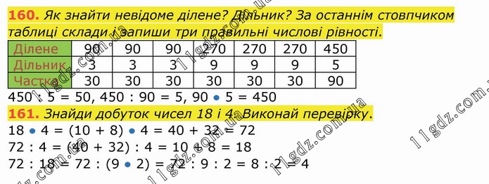 Як знайти невідоме ділене? Дільник? За останнім стовпчиком таблиці склади і запиши три правильні числові рівності. Ділене 90 90 90 270 270 270 450 Дільник 3 3 3 9 9 9 5 Частка 30 30 30 30 30 30 90 450 : 5 = 50, 450 : 90 = 5, 90 ● 5 = 450 161. Знайди добуток чисел 18 і 4. Виконай перевірку. 18 ● 4 = (10 + 8) ● 4 = 40 + 32 = 72 72 : 4 = (40 + 32) : 4 = 10 + 8 = 18 72 : 18 = 72 : (9 ● 2) = 72 : 9 : 2 = 8 : 2 = 4