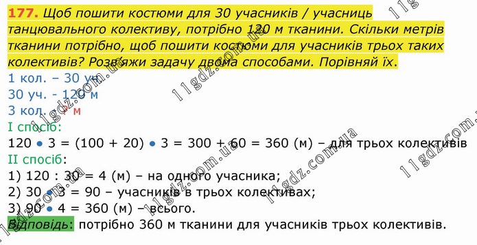Щоб пошити костюми для 30 учасників / учасниць танцювального колективу, потрібно 120 м тканини. Скільки метрів тканини потрібно, щоб пошити костюми для учасників трьох таких колективів? Розв’яжи задачу двома способами. Порівняй їх. 1 кол. – 30 уч. 30 уч. - 120 м 3 кол. - ? м І спосіб: 120 ● 3 = (100 + 20) ● 3 = 300 + 60 = 360 (м) – для трьох колективів ІІ спосіб: 1) 120 : 30 = 4 (м) – на одного учасника; 2) 30 ● 3 = 90 – учасників в трьох колективах; 3) 90 ● 4 = 360 (м) – всього. Відповідь: потрібно 360 м тканини для учасників трьох колективів.