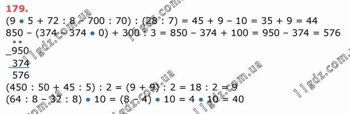 (9 ● 5 + 72 : 8 – 700 : 70) : (28 : 7) = 45 + 9 – 10 = 35 + 9 = 44 850 – (374 – 374 ● 0) + 300 : 3 = 850 – 374 + 100 = 950 – 374 = 576 _9(*)5(*)0 374 576 (450 : 50 + 45 : 5) : 2 = (9 + 9) : 2 = 18 : 2 = 9 (64 : 8 – 32 : 8) ● 10 = (8 – 4) ● 10 = 4 ● 10 = 40