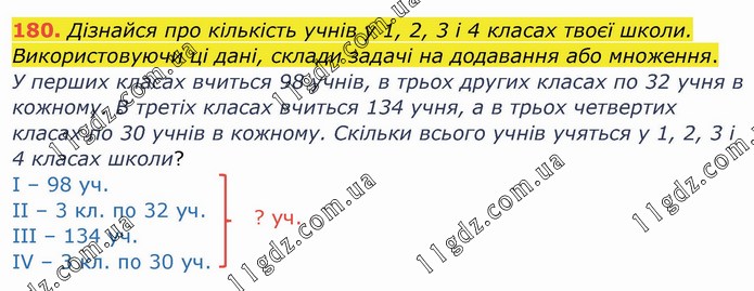 Дізнайся про кількість учнів у 1, 2, 3 і 4 класах твоєї школи. Використовуючи ці дані, склади задачі на додавання або множення. У перших класах вчиться 98 учнів, в трьох других класах по 32 учня в кожному. В третіх класах вчиться 134 учня, а в трьох четвертих класах по 30 учнів в кожному. Скільки всього учнів учяться у 1, 2, 3 і 4 класах школи? І – 98 уч. ІІ – 3 кл. по 32 уч. ІІІ – 134 уч. ІV – 3 кл. по 30 уч.