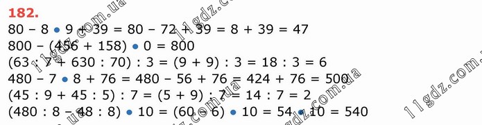 80 – 8 ● 9 + 39 = 80 – 72 + 39 = 8 + 39 = 47 800 – (456 + 158) ● 0 = 800 (63 : 7 + 630 : 70) : 3 = (9 + 9) : 3 = 18 : 3 = 6 480 – 7 ● 8 + 76 = 480 – 56 + 76 = 424 + 76 = 500 (45 : 9 + 45 : 5) : 7 = (5 + 9) : 7 = 14 : 7 = 2 (480 : 8 – 48 : 8) ● 10 = (60 – 6) ● 10 = 54 ● 10 = 540