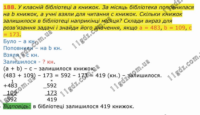У класній бібліотеці a книжок. За місяць бібліотека поповнилася на b книжок, а учні взяли для читання c книжок. Скільки книжок залишилося в бібліотеці наприкінці місяця? Склади вираз для розв’язання задачі і знайди його значення, якщо a = 483, b = 109, c = 173. Було – а кн. Поповнили – на b кн. Взяли – с кн. Залишилося - ? кн. (а + b) – c – залишилося книжок. (483 + 109) – 173 = 592 – 173 = 419 (кн.) – залишилося. +48(1)3 109 592 _59(*)2 173 419 Відповідь: в бібліотеці залишилося 419 книжок.