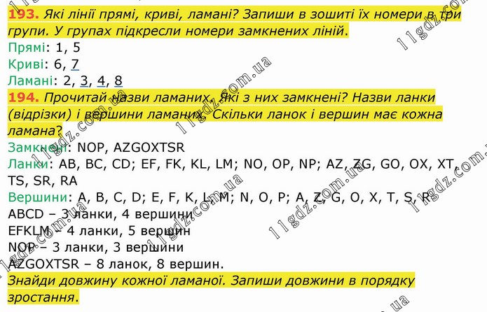 Які лінії прямі, криві, ламані? Запиши в зошиті їх номери в три групи. У групах підкресли номери замкнених ліній. Прямі: 1, 5 Криві: 6, 7 Ламані: 2, 3, 4, 8 194. Прочитай назви ламаних. Які з них замкнені? Назви ланки (відрізки) і вершини ламаних. Скільки ланок і вершин має кожна ламана? Замкнені: NOP, AZGOXTSR Ланки: AB, BC, CD; EF, FK, KL, LM; NO, OP, NP; AZ, ZG, GO, OX, XT, TS, SR, RA Вершини: A, B, C, D; E, F, K, L, M; N, O, P; A, Z, G, O, X, T, S, R ABCD – 3 ланки, 4 вершини EFKLM – 4 ланки, 5 вершин NOP – 3 ланки, 3 вершини AZGOXTSR – 8 ланок, 8 вершин. Знайди довжину кожної ламаної. Запиши довжини в порядку зростання.