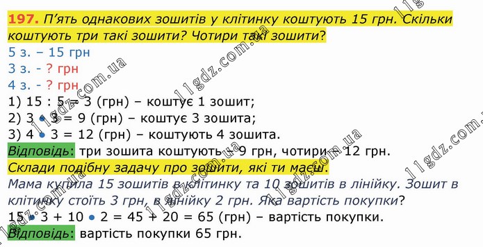 П’ять однакових зошитів у клітинку коштують 15 грн. Скільки коштують три такі зошити? Чотири такі зошити? 5 з. – 15 грн 3 з. - ? грн 4 з. - ? грн 1) 15 : 5 = 3 (грн) – коштує 1 зошит; 2) 3 ● 3 = 9 (грн) – коштує 3 зошита; 3) 4 ● 3 = 12 (грн) – коштують 4 зошита. Відповідь: три зошита коштують – 9 грн, чотири – 12 грн. Склади подібну задачу про зошити, які ти маєш. Мама купила 15 зошитів в клітинку та 10 зошитів в лінійку. Зошит в клітинку стоїть 3 грн, в лінійку 2 грн. Яка вартість покупки? 15 ● 3 + 10 ● 2 = 45 + 20 = 65 (грн) – вартість покупки. Відповідь: вартість покупки 65 грн.