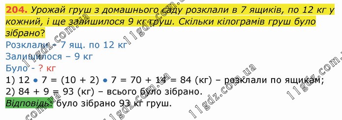 Урожай груш з домашнього саду розклали в 7 ящиків, по 12 кг у кожний, і ще залишилося 9 кг груш. Скільки кілограмів груш було зібрано? Розклали – 7 ящ. по 12 кг Залишилося – 9 кг Було - ? кг 1) 12 ● 7 = (10 + 2) ● 7 = 70 + 14 = 84 (кг) – розклали по ящикам; 2) 84 + 9 = 93 (кг) – всього було зібрано. Відповідь: було зібрано 93 кг груш.