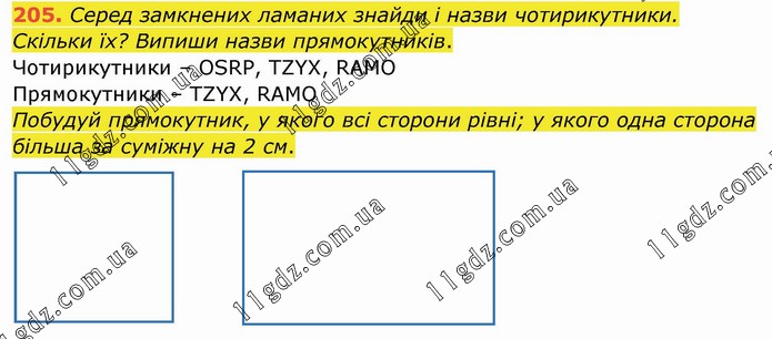 Серед замкнених ламаних знайди і назви чотирикутники. Скільки їх? Випиши назви прямокутників. Чотирикутники – OSRP, TZYX, RAMO Прямокутники – TZYX, RAMO Побудуй прямокутник, у якого всі сторони рівні; у якого одна сторона більша за суміжну на 2 см.