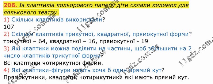 Із клаптиків кольорового паперу діти склали килимок для лялькового театру. 1) Скільки клаптиків використали? 107 2) Скільки клаптиків трикутної, квадратної, прямокутної форми? трикутної – 64, квадратної – 16, прямокутної - 19 3) Які клаптики можна поділити на частини, щоб збільшити на 2 число клаптиків трикутної форми? Всі клаптики чотирикутної форми. 4) Які клаптики-фігури мають хоча б один прямий кут? Прямокутники, квадрати, чотирикутники які мають прямий кут.