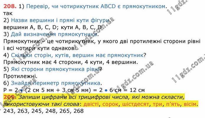 1) Перевір, чи чотирикутник АВСD є прямокутником. так 2) Назви вершини і прямі кути фігури. вершини А, В, С, D; кути А, В, С, D 3) Дай визначення прямокутника. Прямокутник – це чотирикутник, у якого дві протилежні сторони рівні і всі чотири кути однакові. 4) Скільки сторін, кутів, вершин має прямокутник? Прямокутник має 4 сторони, 4 кути, 4 вершини. 5) Які сторони прямокутника рівні? Протилежні. 6) Знайди периметр прямокутника. Р = 2 ● (2 см 5 мм + 3 см 5 мм) = 2 ● 6 см = 12 см 209. Запиши цифрами всі трицифрові числа, які можна скласти, використовуючи такі слова: двісті, сорок, шістдесят, три, п’ять, вісім. 243, 263, 245, 248, 265, 268