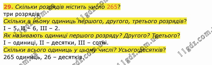 Скільки розрядів містить число 265? три розрядів Скільки в ньому одиниць першого, другого, третього розрядів? І – 5, ІІ – 6, ІІІ – 2. Як називають одиниці першого розряду? Другого? Третього? І – одиниці, ІІ – десятки, ІІІ – сотні. Скільки всього одиниць у цьому числі? Усього десятків? 265 одиниць, 26 – десятків.