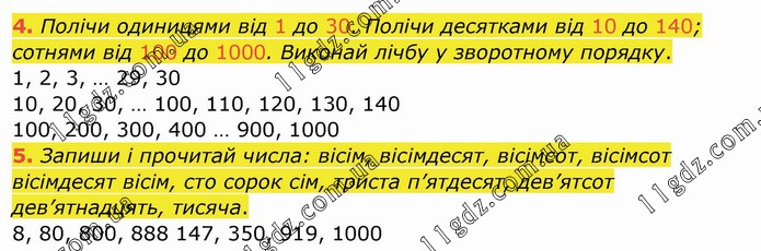 Полічи одиницями від 1 до 30. Полічи десятками від 10 до 140; сотнями від 100 до 1000. Виконай лічбу у зворотному порядку. 1, 2, 3, … 29, 30 10, 20, 30, … 100, 110, 120, 130, 140 100, 200, 300, 400 … 900, 1000 5. Запиши і прочитай числа: вісім, вісімдесят, вісімсот, вісімсот вісімдесят вісім, сто сорок сім, триста п’ятдесят, дев’ятсот дев’ятнадцять, тисяча. 8, 80, 800, 888 147, 350, 919, 1000
