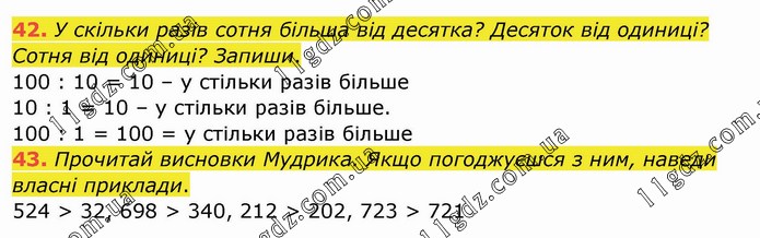 У скільки разів сотня більша від десятка? Десяток від одиниці? Сотня від одиниці? Запиши. 100 : 10 = 10 – у стільки разів більше 10 : 1 = 10 – у стільки разів більше. 100 : 1 = 100 = у стільки разів більше 43. Прочитай висновки Мудрика. Якщо погоджуєшся з ним, наведи власні приклади. 524 > 32, 698 > 340, 212 > 202, 723 > 721
