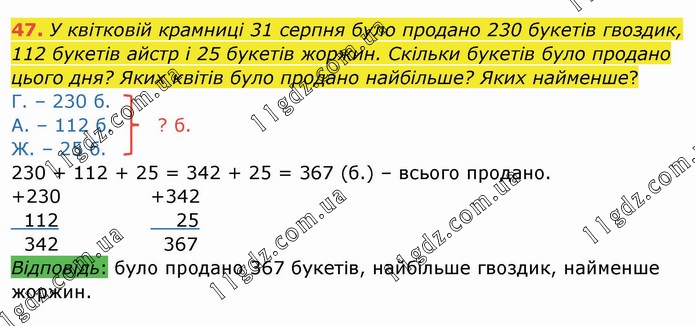 У квітковій крамниці 31 серпня було продано 230 букетів гвоздик, 112 букетів айстр і 25 букетів жоржин. Скільки букетів було продано цього дня? Яких квітів було продано найбільше? Яких найменше? Г. – 230 б. А. – 112 б. ? б. Ж. – 25 б. 230 + 112 + 25 = 342 + 25 = 367 (б.) – всього продано. +230 112 342 +342 25 367 Відповідь: було продано 367 букетів, найбільше гвоздик, найменше жоржин.