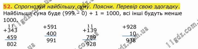 Спрогнозуй найбільшу суму. Поясни. Перевір свою здогадку. Найбільша сума буде (999 – 0) + 1 = 1000, всі інші будуть менше 1000. +3(1)4(1)3 459 802 +591 400 991 +1(1)3(1)9 789 928 +928 10 938