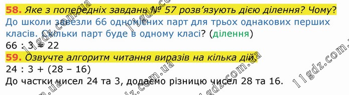 Яке з попередніх завдань № 57 розв’язують дією ділення? Чому? До школи завезли 66 одномісних парт для трьох однакових перших класів. Скільки парт буде в одному класі? (ділення) 66 : 3 = 22 59. Озвучте алгоритм читання виразів на кілька дій. 24 : 3 + (28 – 16) До частки чисел 24 та 3, додаємо різницю чисел 28 та 16.