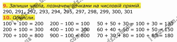 Запиши числа, позначені точками на числовій прямій. 290, 291, 292, 293, 294, 295, 297, 298, 299, 300, 301 10. Обчисли. 100 + 100 = 200 200 + 100 = 300 700 + 100 = 800 200 – 100 = 100 400 – 100 = 300 900 – 100 = 800 50 + 50 + 30 = 100 + 30 = 130 60 + 40 + 50 = 100 + 50 = 150 70 + 30 + 80 = 100 + 80 = 180