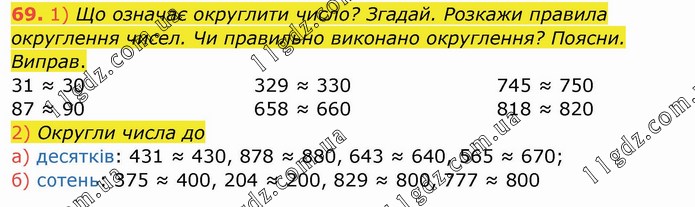 1) Що означає округлити число? Згадай. Розкажи правила округлення чисел. Чи правильно виконано округлення? Поясни. Виправ. 31 ≈ 30 87 ≈ 90 329 ≈ 330 658 ≈ 660 745 ≈ 750 818 ≈ 820 2) Округли числа до а) десятків: 431 ≈ 430, 878 ≈ 880, 643 ≈ 640, 565 ≈ 670; б) сотень: 375 ≈ 400, 204 ≈ 200, 829 ≈ 800, 777 ≈ 800