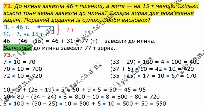 До млина завезли 46 т пшениці, а жита — на 15 т менше. Скільки всього тонн зерна завезли до млина? Склади вираз для розв’язання задачі. Порівняй доданки із сумою. Зроби висновок? П. – 46 т. Ж. - ?, на 15 т < 46 + (46 – 15) = 46 + 31 = 77 (т) – завезли до млина. Відповідь: до млина завезли 77 т зерна. 73. 7 ● 10 = 70 70 ● 10 = 700 72 ● 10 = 720 (33 – 29) ● 100 = 4 ● 100 = 400 (37 + 5) ● 10 = 42 ● 10 = 420 (35 – 25) ● 17 = 10 ● 17 = 170