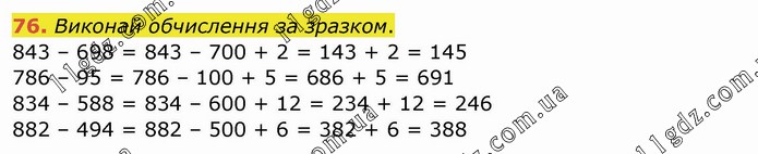 Виконай обчислення за зразком. 843 – 698 = 843 – 700 + 2 = 143 + 2 = 145 786 – 95 = 786 – 100 + 5 = 686 + 5 = 691 834 – 588 = 834 – 600 + 12 = 234 + 12 = 246 882 – 494 = 882 – 500 + 6 = 382 + 6 = 388