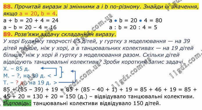 Прочитай вирази зі змінними а і b по-різному. Знайди їх значення, якщо а = 20, b = 4. а + b = 20 + 4 = 24 а – b = 20 – 4 = 16 а ● b = 20 ● 4 = 80 а : b = 20 : 4 = 5 89. Розв’яжи задачу складанням виразу. У хорі Будинку творчості 85 дітей, у гуртку з моделювання — на 39 дітей менше, ніж у хорі, а в танцювальних колективах — на 19 дітей більше, ніж у хорі й гуртку з моделювання разом. Скільки дітей відвідують танцювальні колективи? Зроби короткий запис задачі. Х. – 85 д. М. – ?, на 39 д. < Т. – ? д., на 19 д. > 85 + (85 – 39) + 19 = 85 + (85 – 40 + 1) + 19 = 85 + 46 + 19 = 85 + 45 + 20 = 130 + 20 = 150 (д.) – відвідувало танцювальні колективи. Відповідь: танцювальні колективи відвідувало 150 дітей.
